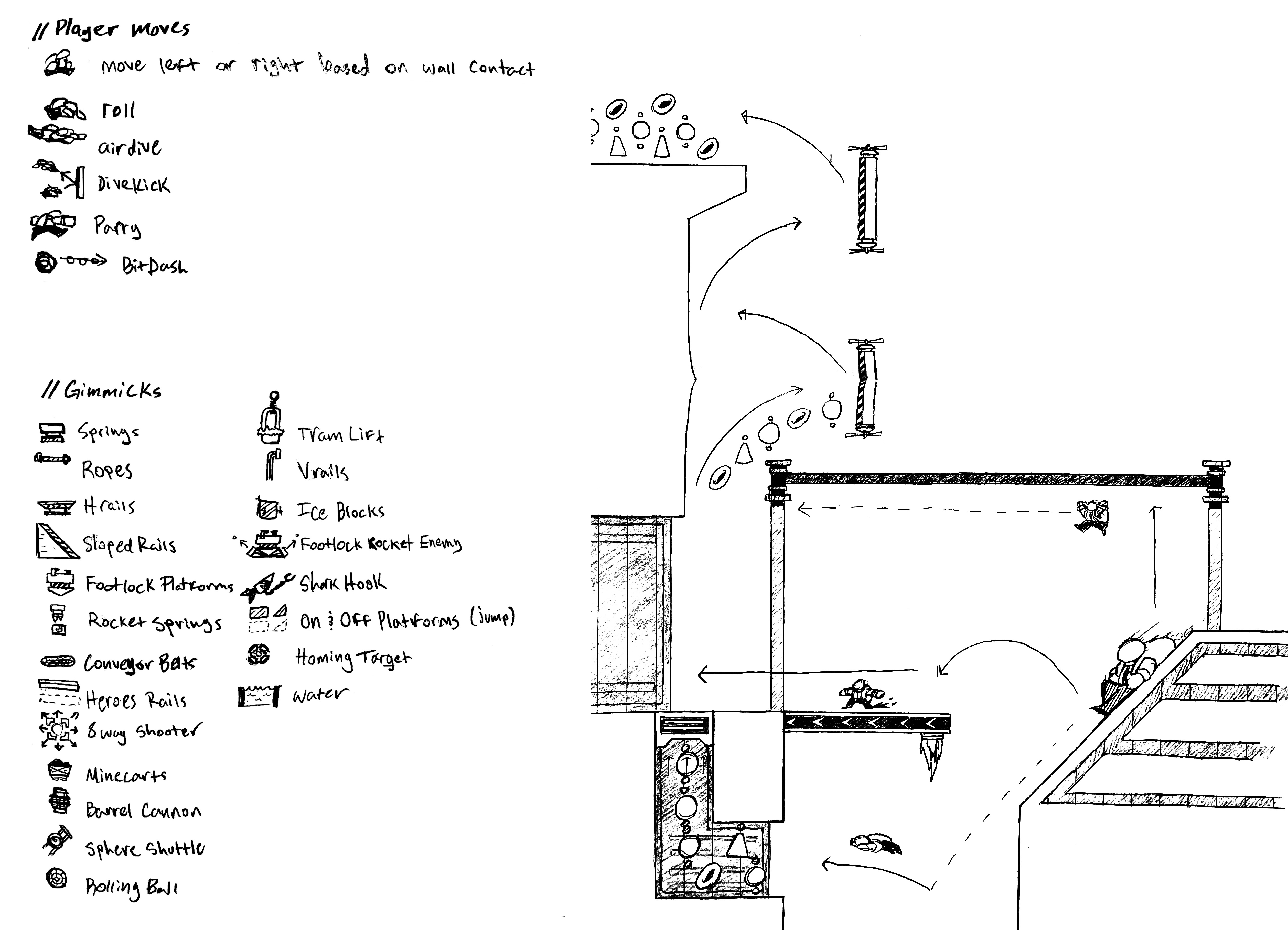 REFINING IDEASI kept the auto-running behavior, disabled left and right input, and made horizontal collision with walls reverse the character's speed and direction. If I placed this character in a traditional horizontal platforming stage, it wouldn't make good use of the wall dependent movement mechanics. I decided on designing a tall vertical stage with a mix of vertical and horizontal platforming challenges. With that settled, I brainstormed, designed, and developed various vertical movement options to compliment the horizontal movement in the vertical space.