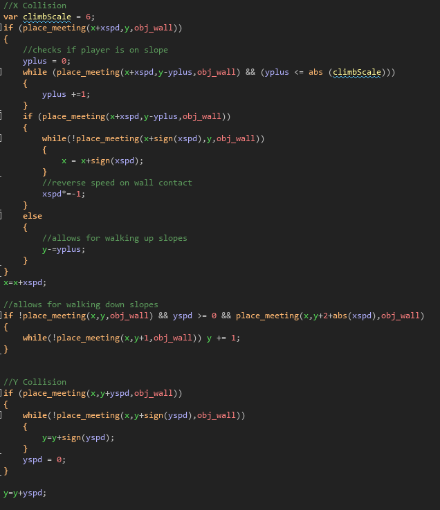SCALABLE COLLISION SYSTEM To support the wall bouncing terrain-dependent movement, I programmed a scalable wall collision detection system. This system checks for wall collisions in the direction of player movement using X and Y speed components of the player. For example: When the player's X value + Horizontal Speed is colliding with a wall, I then loop through shifting the player pixel by pixel until direct physical contact resulting in reversed speed. This robust system prevents getting stuck in walls and always aligns the player perfectly with the wall.