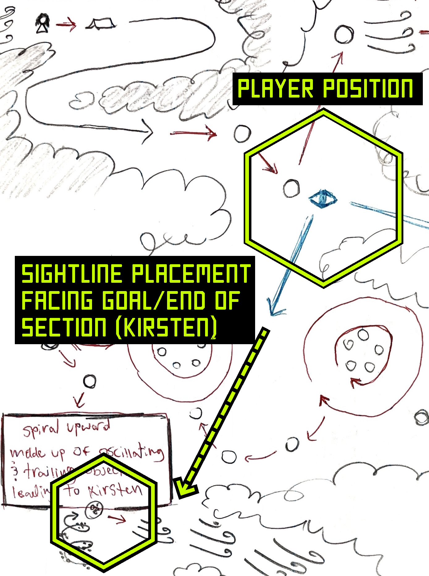 TRANSLATION TO 3DThe goal was to communicate the spatial design without needing an accurate 3D layout yet. This was achieved through designing 2D sight lines and general object and cloud placement to guide and block what the player sees. I used a blue eye icon followed by an arrow to signify what will be visible in 3D space from the player's perspective in that position. Red arrows signify general traversal beats to later be greyboxed and designed in Unreal Engine 4's level editor.