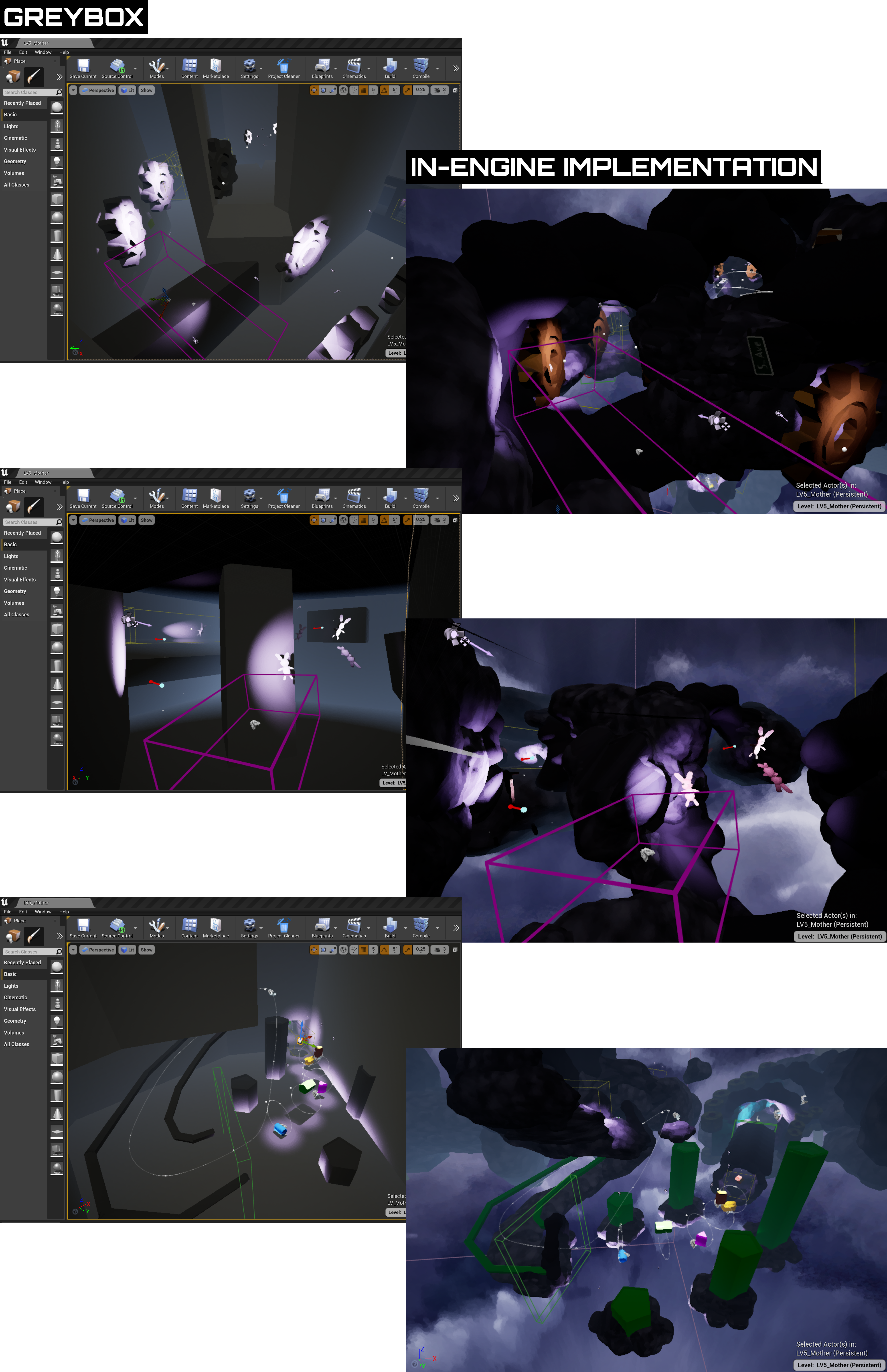 DEVELOPMENT & GREYBOXINGThe first thing I decided on was using clouds and lighting to frame the space more intentionally. Visual formations like tunnels, corkscrews, leading lines, combined with effective use of lighting to guide the player's eyes along these structures and cloud formations helps guide the player's attention to where they need to go. Another important revision was handling gimmick usage. The level now introduces one gimmick at the begining of each section, builds upon the complexity of its usage during that section, and stays as a consistent component of the design for the rest of the level. The use of setpieces like the subway station or the large crib allows the environment to reflect its respective family member.