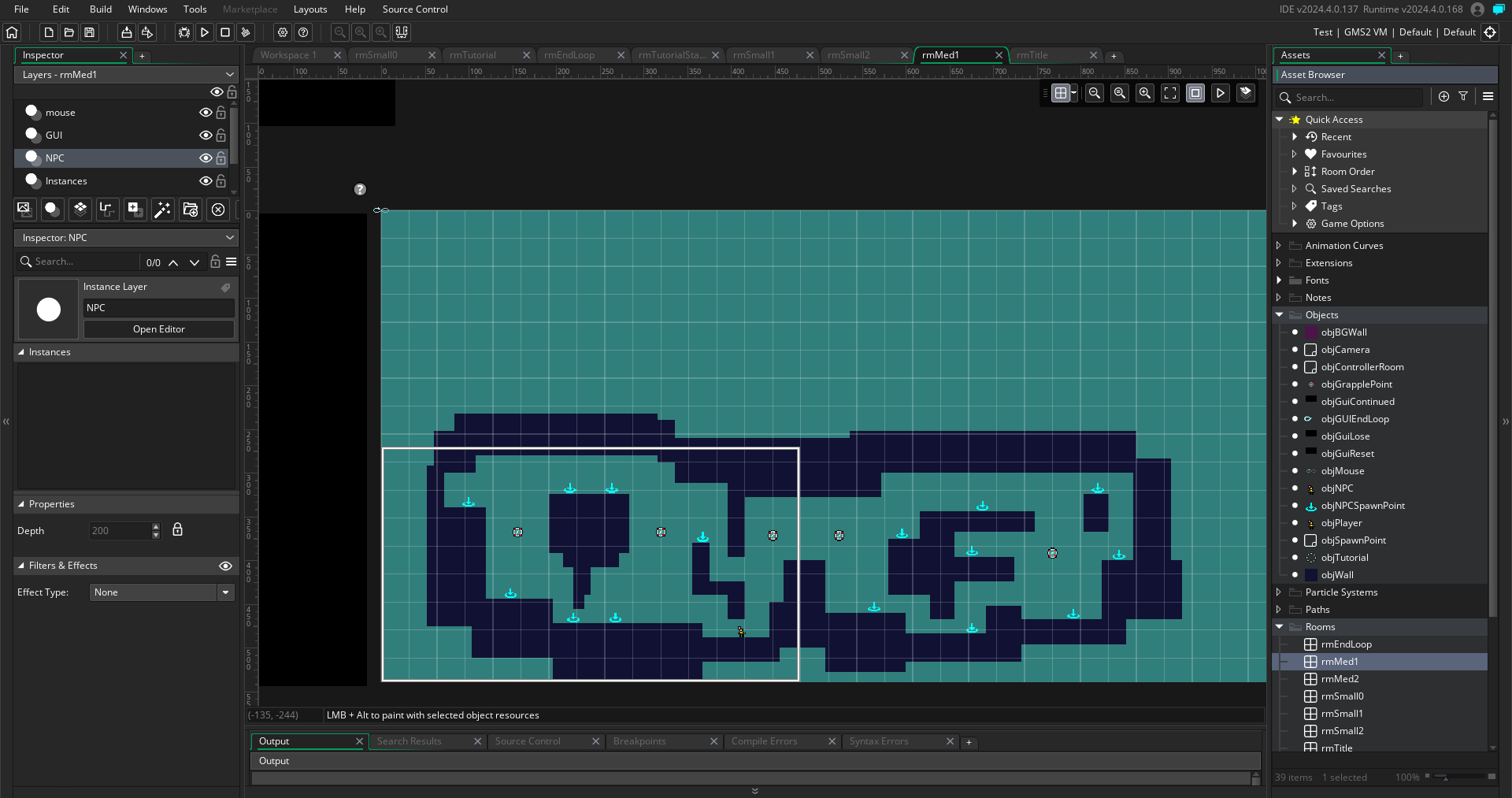 GAME ELEMENTSThe five day development cycle was focused on player movement, NPC behavior, designing levels, and visuals such as UI and animations. I needed to make sure players had movement options to accurately avoid the non-loop NPCs. I have the player a jump, wall jump, and a grapple mechanic allowing them to shoot towards grapple points in the level. The NPC behavior I developed is split into three types: preset, random calm, and random energetic. All NPCs in each loop are randomly chosen as each of these, except for the one always has a predetermined move set that loops. That move set is chosen randomly from a list of movements I defined. I designed the UI and visual style to be as simple and responsive as possible to allow players to focus on watching the NPCs movements. Screen transitions are fluid from one to the next concealing the seams between levels.