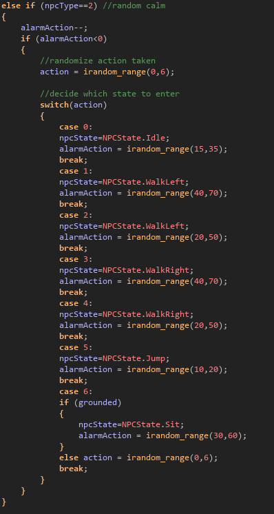 NPC DESCISION MAKING BEHAVIOURRandomized NPC calm and eratic behavior is determined by a set of rules given to each type. Calm NPCs are restricted to idleing, walking, sitting, and jumping, with curated randomization deciding range of time spent in each state. Eratic NPCs can do all of those actions in addition to running, and all state transitions and time spent in each state is not curated to allow for a more unpredictable and chaotic behavior.