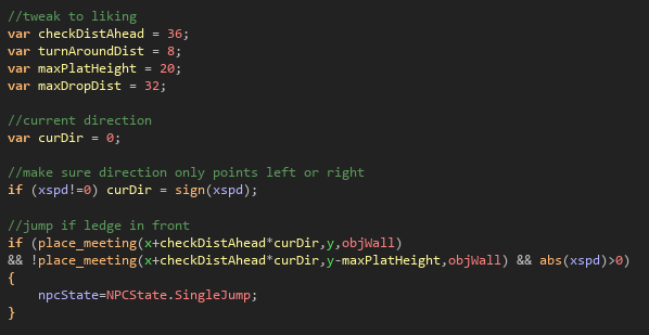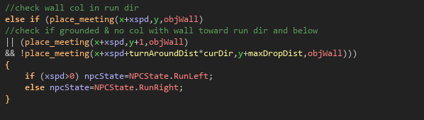 NPC DECIDE TO TURN AROUND Calculates and determines if NPC should turn around, based on a grounded check, distance away from ledge, and a max drop height the NPC is allowed to drop down from.