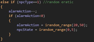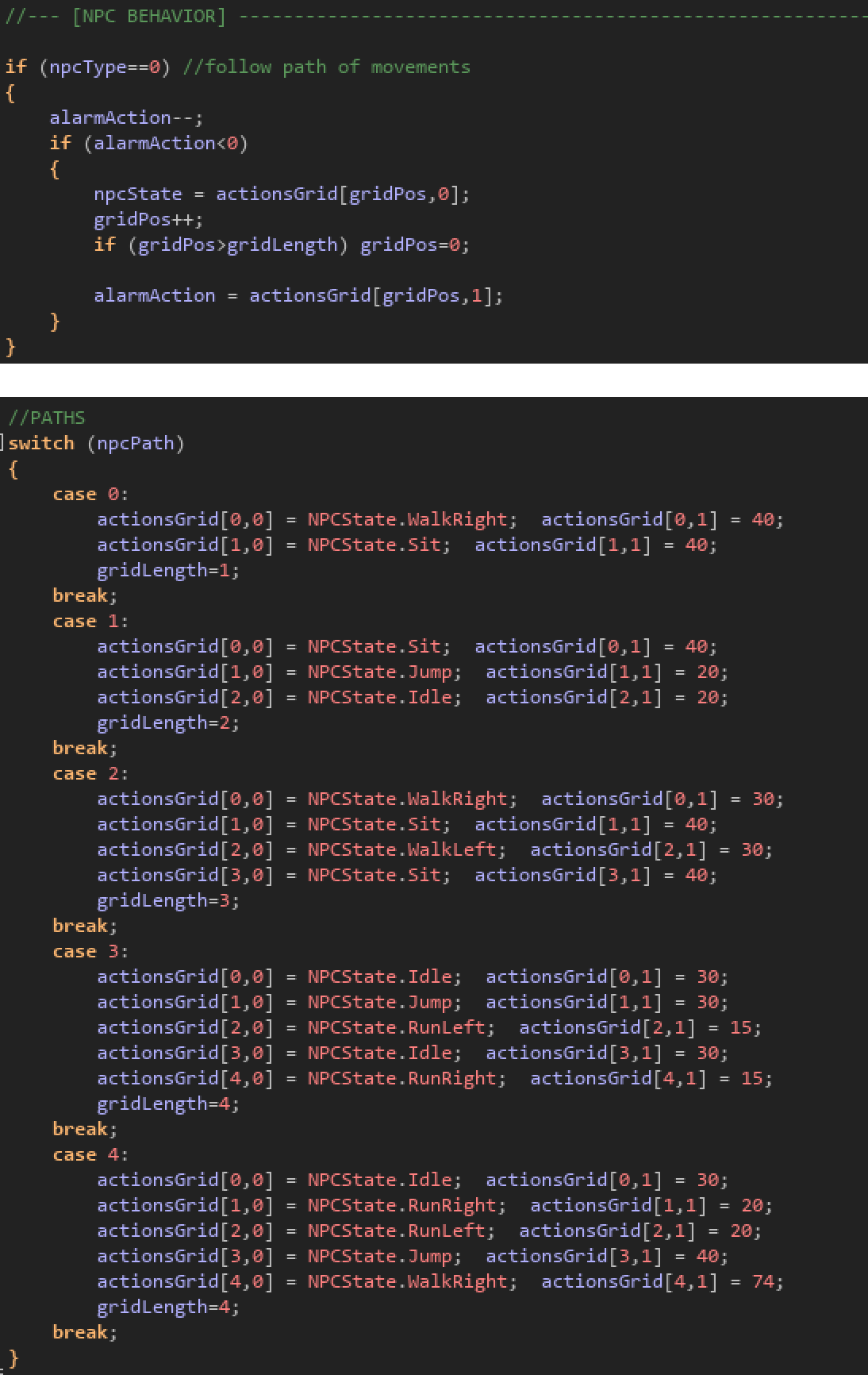 PRESET NPC LOGICThe preset NPC behavior is determined by a list of predetermined movement patterns that I authored. Using a 2D array, I defined each element: [movement state, state duration], and the NPC executes each movement in order for the specified duration before looping back to the start of the list. I use a variable called npcPath to randomly assign one of these predetermined paths to the preset NPC each loop, giving it a consistent but varied behavior each time.